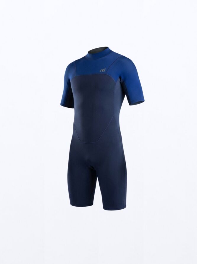Mens’ shorty 2.5mm neoprene wetsuits are short-sleeved and knee-length, designed for summer water sports, providing warmth, sun protection (UPF50+) and wind resistance.